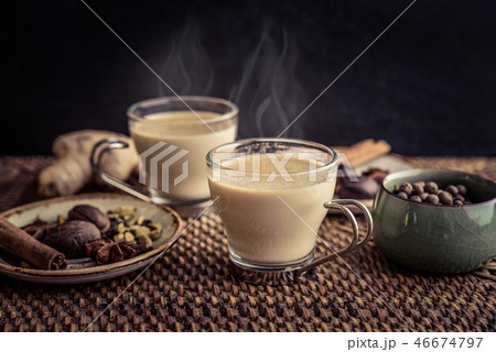 Masala chai an Indian restaurant, spiced milk tea, traditional cardamom hot drink with spices