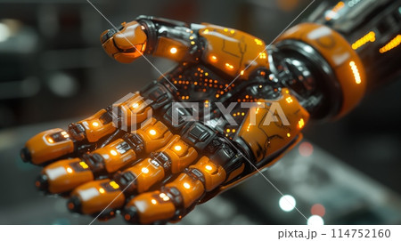 Orange robotic hand in futuristic setting