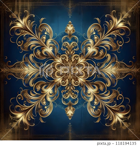 A bright indigo background with an intricate gold-decorated design.