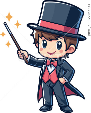Child magician or illusionist doing the trick flat vector illustration isolated.