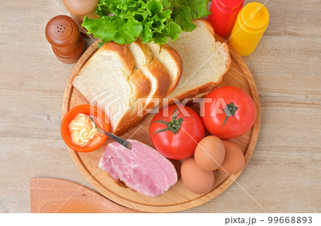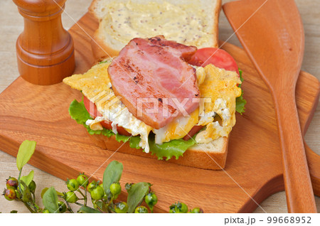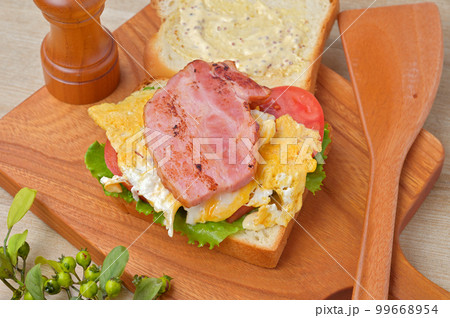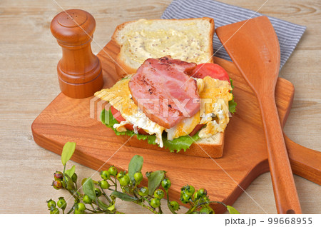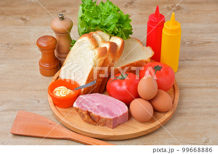 サンドイッチ、BLTサンドの食材イメージ、調理イメージ。食パン、厚切りベーコン、トマトなど。