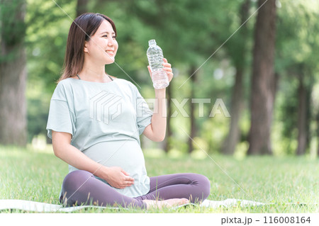 森・公園でマタニティヨガ・プレママヨガ・森・公園でマタニティヨガ・をする若いアジア人女性(水分補給)