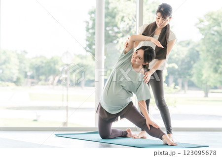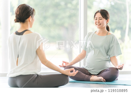 ヨガ教室でマタニティヨガを行う若い妊婦の女性