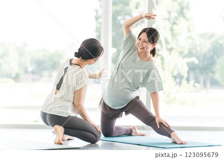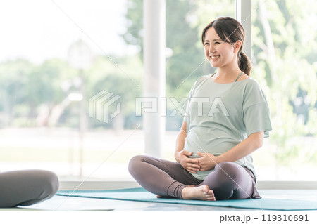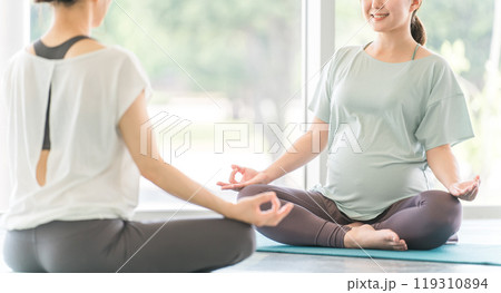 ヨガ教室でマタニティヨガを行う若い妊婦の女性
