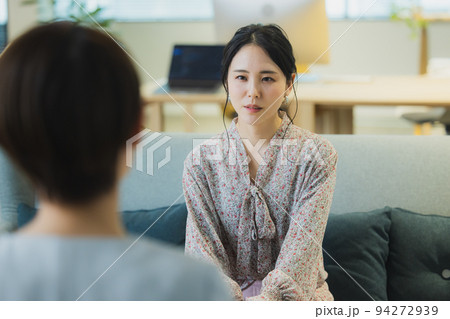 オフィスの休憩スペースで相談を受けるミドル女性