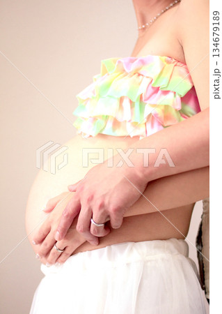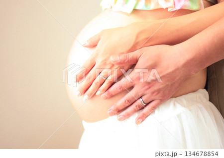 出産間近の妊婦さんのお腹と手 マタママ プレママ