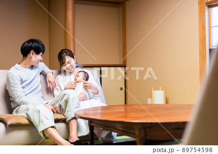 赤ちゃんと温泉旅行を楽しむ若いファミリー