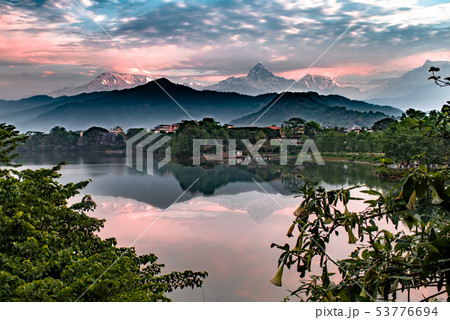 南アジアのネパールポカラ ダムサイドからのマチャプチャレとアンナプルナ山群の眺望とフェワ湖面の水鏡