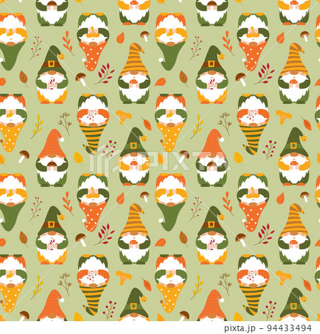 Seamless pattern with cute autumn gnomes holding mushroom, leaves, twigs. Backdrop of forest dwarfs for wrapping paper, wallpaper, textile. Cartoon vector characters on light green background