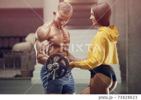 Brutal strong bodybuilder athletic men pumping up muscles with d