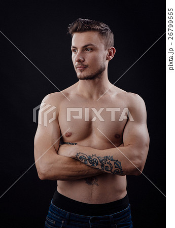 Portrait of athletic smiling tattooed guy. Studio shot, isolated