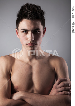 Young male athlete posing. Handsome athletic male power guy. Fitness muscular person. Young athlete showing muscles in the studio, posing shirtless on gray background.