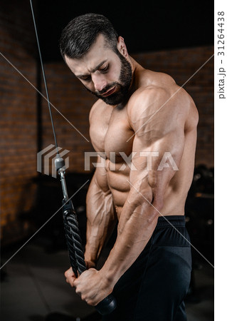 Brutal strong bodybuilder man pumping up muscles and train gym
