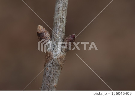 自然 植物 ゴマギ、一月の冬芽。外側の芽鱗が取れ、滑らかで細毛に覆われた内側の芽鱗が露出した状態