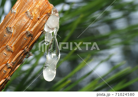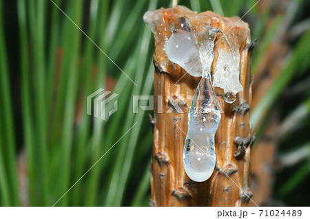 常緑高木のクロマツから分泌された透明の美しい松ヤニ