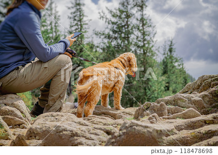 Abstract person sitting on rocky terrain with golden retriever on leash, enjoying nature hike