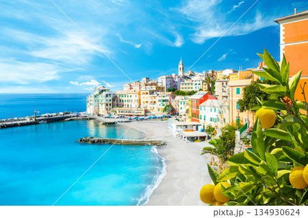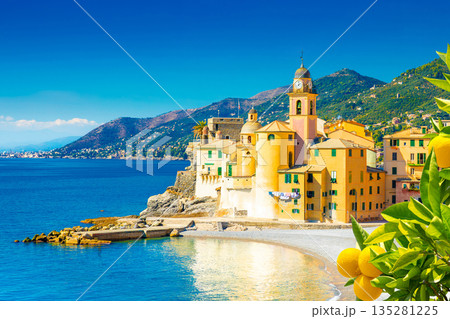Scenic Mediterranean riviera coast. Panoramic view of Camogli town in Liguria, Italy