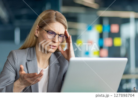 Frustrated businesswoman with glasses using laptop in office. She appears confused and stressed while working on computer. Professional attire suggesting corporate environment