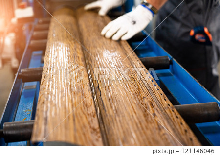 A factory worker is making a metal profile for a roof. Worker at factory measures metal profiled sheet. He works in metal production industrial. metal roofing production, production of roof elements