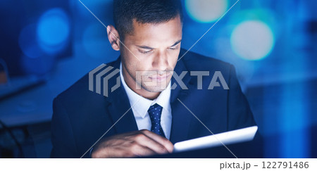 Businessman with digital tablet overtime for data research in a corporate office at night. Male entrepreneur and executive worker using technology to communicate and network with online app or email