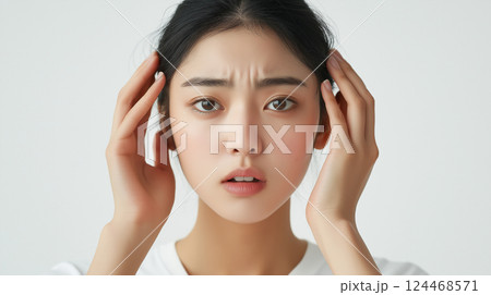 困って頭を抱えている女性