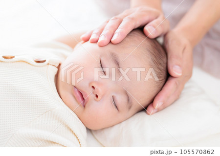 子どもが風邪で寝ていて看病する母親