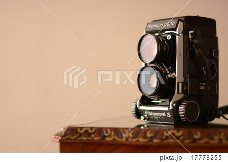 アンティーク二眼レンズ フィルムカメラを マホガニーテーブルに置く. 英国アンティーク家具