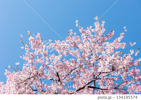 素晴らしい青空に広がる満開の桜の花のアップ15