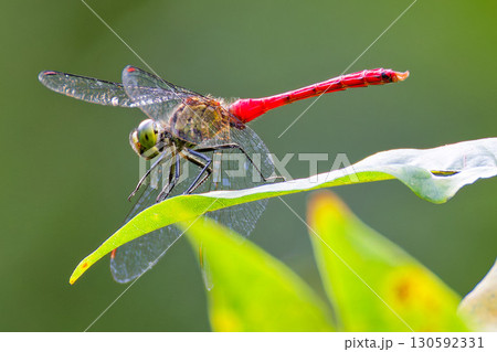 葉の上に止まるトンボ科マユタテアカネ成熟♂