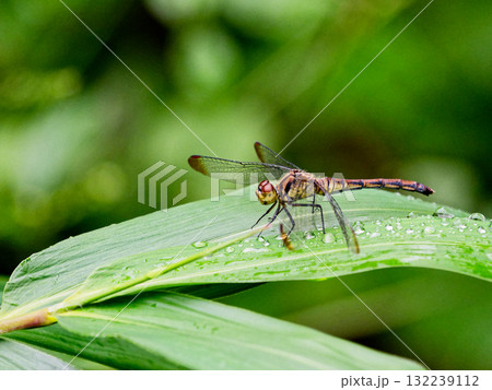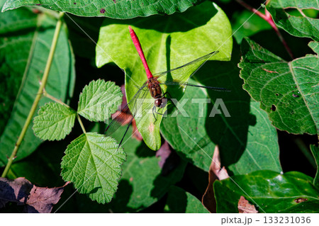 水辺の葉にとまる赤トンボ