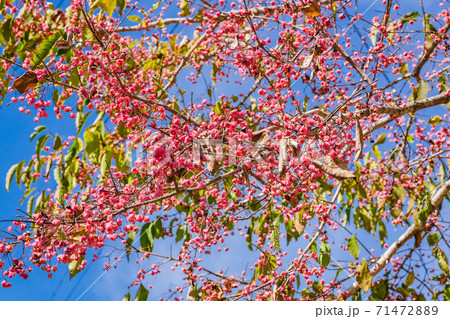 秋 ピンクの実を付けたマユミの木