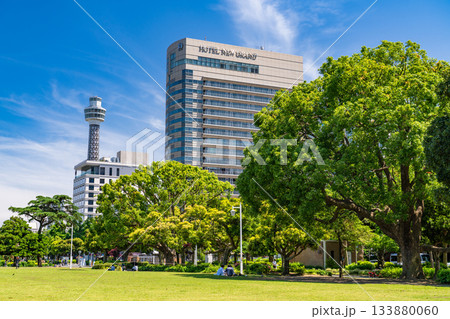 日本の横浜都市景観 山下公園前の横浜マリンタワーやホテルニューグランドなどを望む