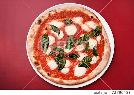 ピザ(ピッツァ)マルゲリータ、トマトソースとモッツアレラチーズ、バジル(ハーブ)のシンプルなピザ。