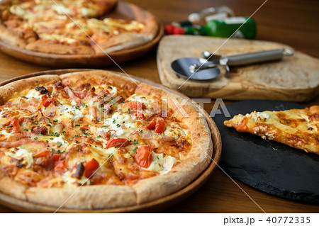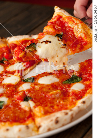 ピザ、ピッツア、マルゲリータ。PIZZA、トマトソースとモッツァレラチーズとバジルのピザ。