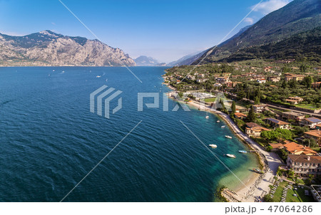 Aerial drone view of Lago di Garda (lake Garda) coastline, Italy. The beach and fresh blue water.