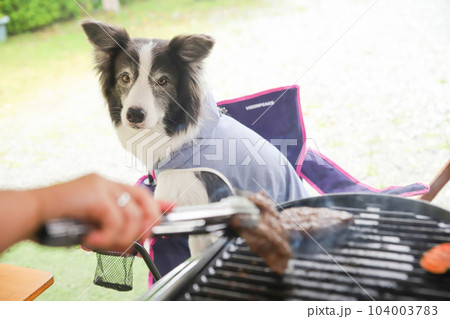 バーベキューコンロで焼いている野菜に釘付けになる犬