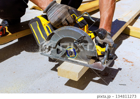 Worker operates circular saw to cut timber at construction site dust flies from wood beams