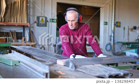 A carpenter saws a long narrow board on a circular saw in an open-plan workshop, working with wood on a machine tool, processing and preparing building material in a carpentry shop