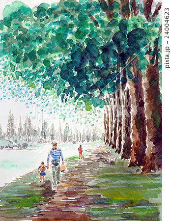 新緑の並木道 散歩する親子のスケッチ