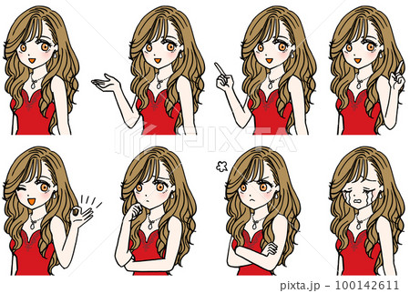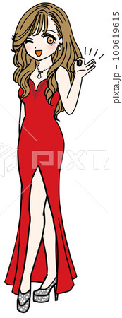 OKサインを出す赤いドレスのキャバ嬢(全身)
