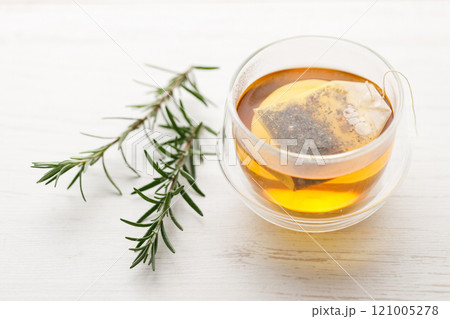Cup of hot tea blended from rooibos, spearmint, apple, baobab on white wooden table.