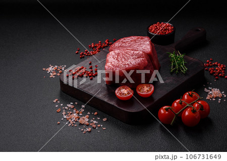 Raw fillet steak mignon beef with salt, spices and herbs