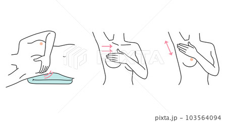 Woman performing breast self-examination, checking for lumps or abnormalities. Concept of health, female anatomy, and oncology prevention