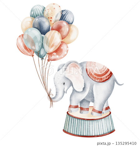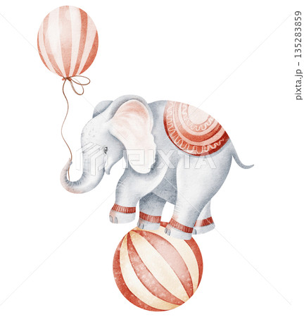 Circus elephant balancing on ball with balloon. Watercolor illustration for children, nursery, birthday cards, posters, and invitations. Cute cartoon animal isolated on white.