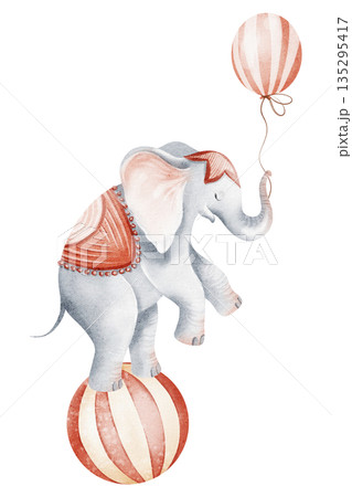 Watercolor illustration of a circus elephant balancing on a ball. Ideal for children's books, nursery decor, invitations, and birthday cards. Cute cartoon style.