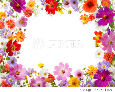 色鮮やかなコスモスや花々で囲まれた白背景フレームデザイン