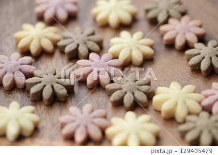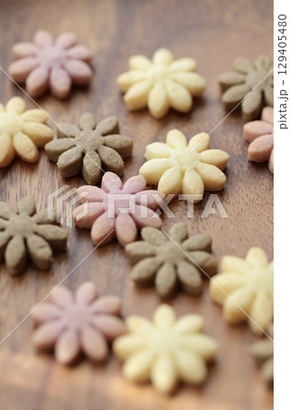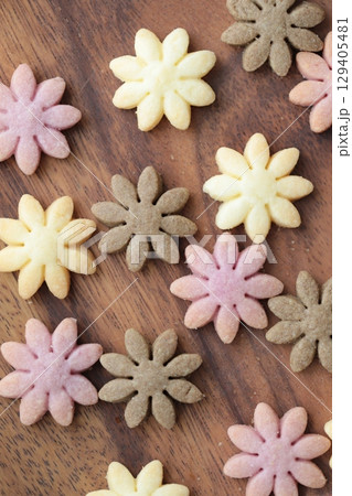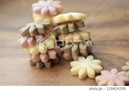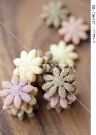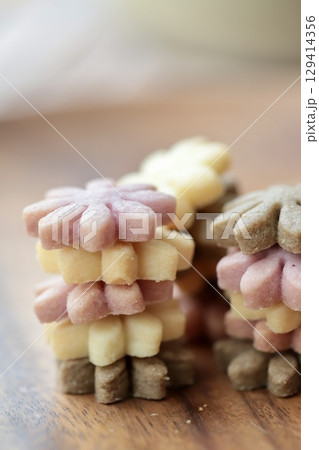 縦に積み上げたマーガレット型の紫芋とココアとプレーンクッキー