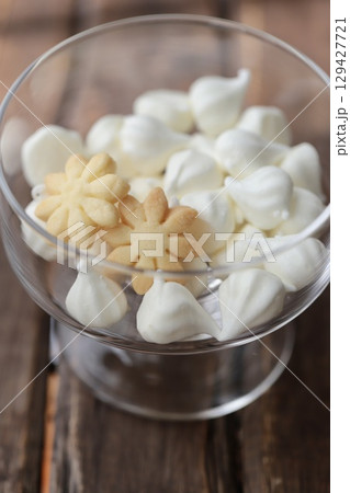 デザートガラスに入れたメレンゲクッキーとマーガレット型クッキー