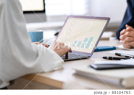 Investor pointing at financial data while presenting marketing idea. Apparatus.