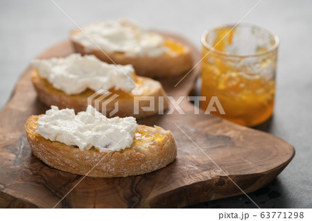 Ciabatta slices with orange marmalade and ricotta on olive board